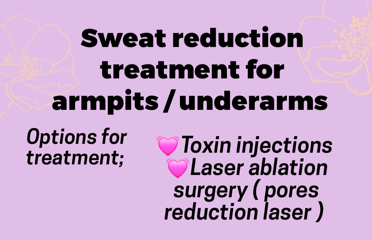 There are 2 types of procedures which are effective for excessive sweating in body areas, most common areas are underarms / armpits , hands and chest areas and breast areas . The breast areas injections and lasers are also available. This procedure reduces the sweating on the procedure area only.