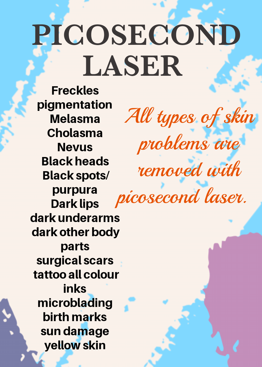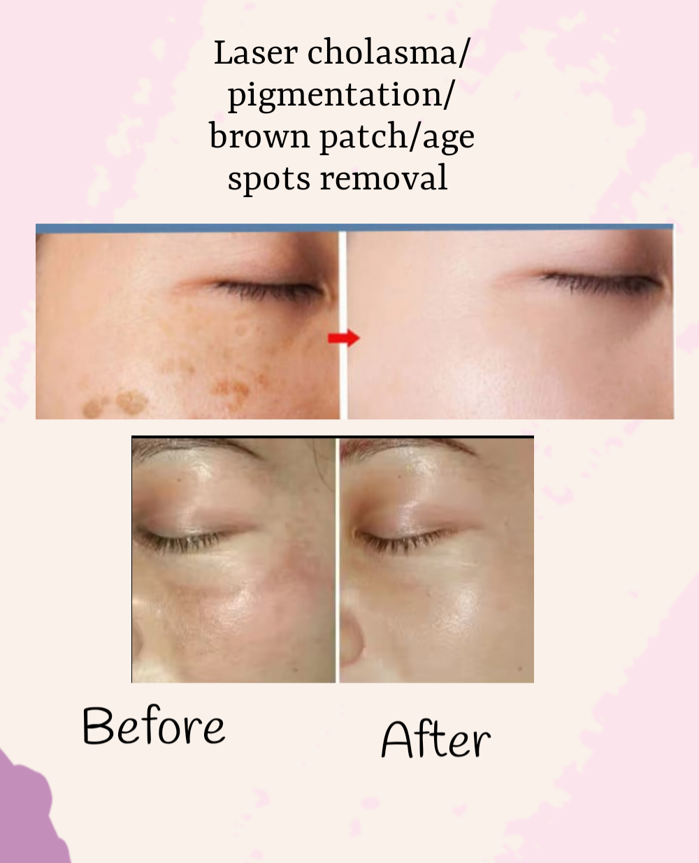 for freckles , pigmentation, cholasma ,tattoos,Nevus,skin tags , moles, surgical scars , acne scars ,melasma, cholasma and other skin problems REMOVAL :