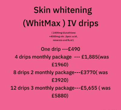 Skin whitening Glutathione IM injections monthly package is £780 ( was £880) include 8 injections with vitamin C.