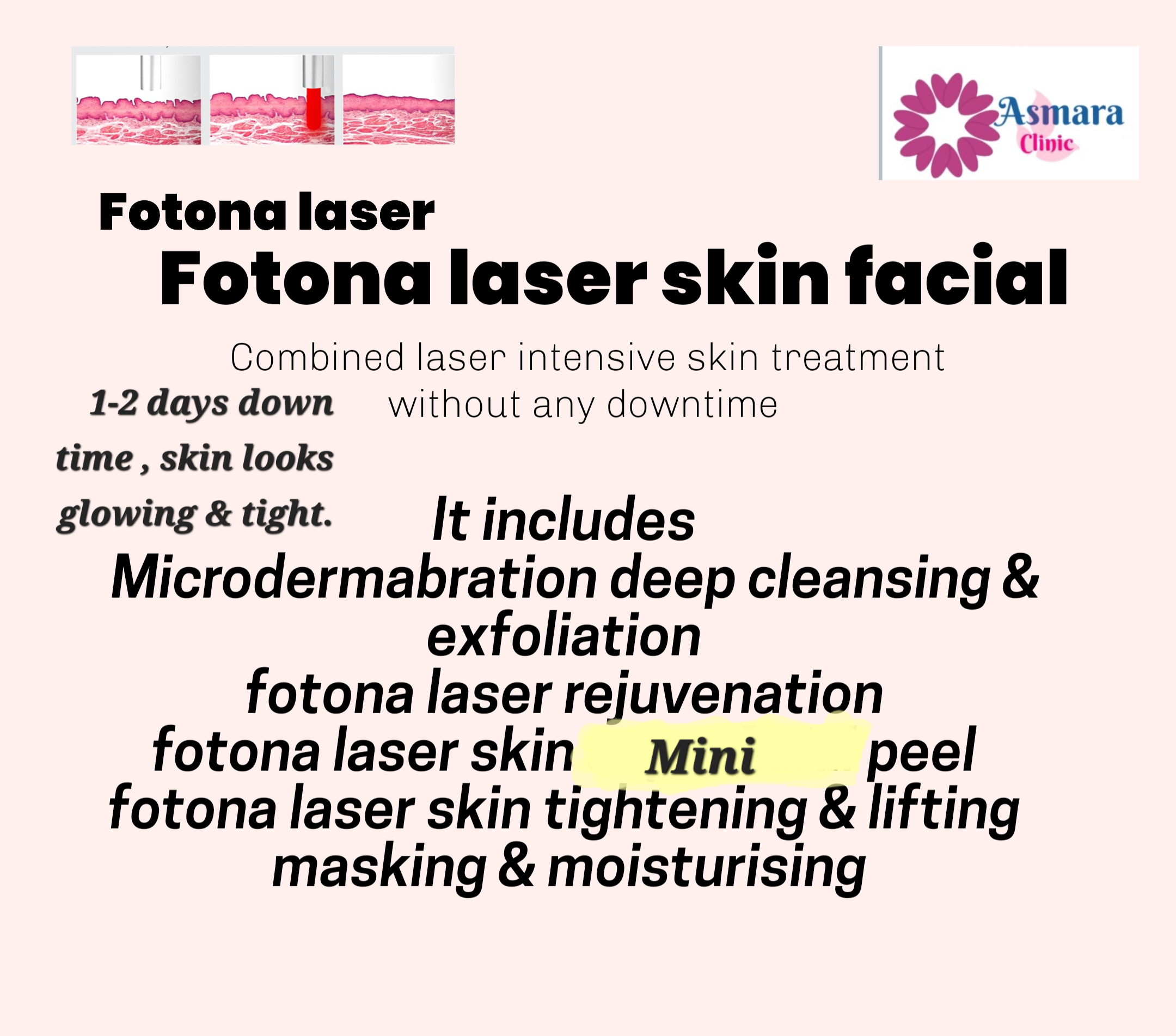 It includes the Skin rejuvenation and skin tightening and mini laser treatment to recover in a day or 2. There is minimum downtime and no pain. Treatment duration can be 90 to 120 minutes.