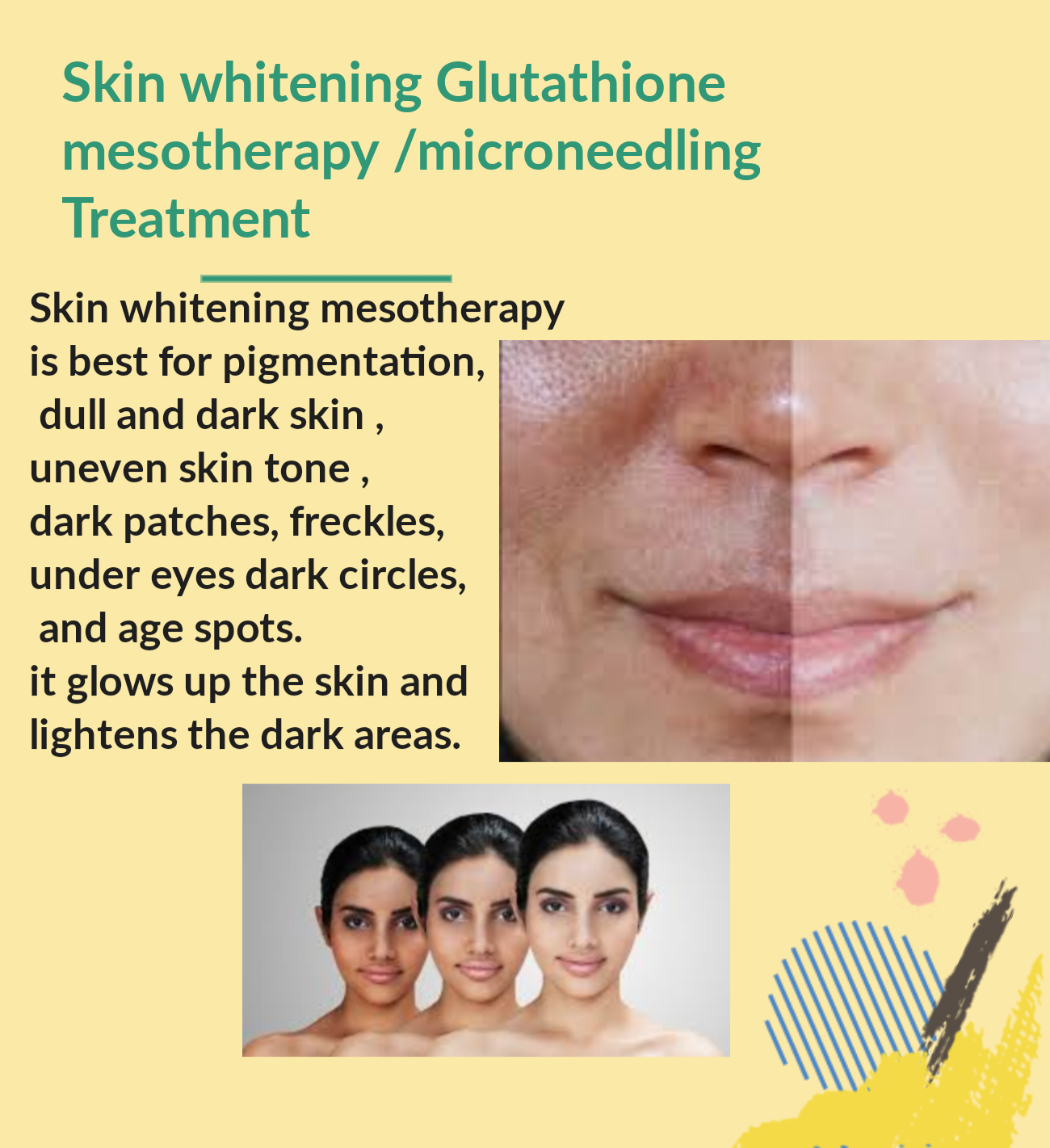 Treatment includes Glutathione, hyaluronic acid and vitamin c skin serums , brightening face mask application Skin treatment with microneedling.