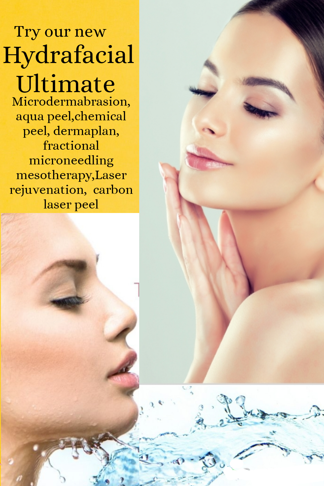 Aqua Microdermabration ,Aqua jet peel, oxygen therapy,scrubbing ,deep pores extraction & cleansing , chemical peel and optional dermaplan, fractional microneedling, oxygen , bio , collagen therapy , PDT LED ,ultrasound, deep Cleanser, 4  different types of masks , 4 different types of radiofrequency, vacuum radiofrequency,bipolar radiofrequency, advanced radiofrequency & multi polar radiofrequency.