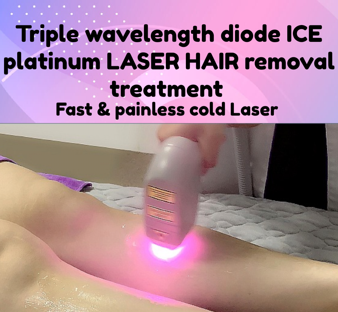 This ICE 3D laser hair removal permanent is for all skin types and for all colours of hair except white hairs. 3 D laser shot 3 wavelengths at 3000watt power that’s why all our clients find this laser perfect for hair loss