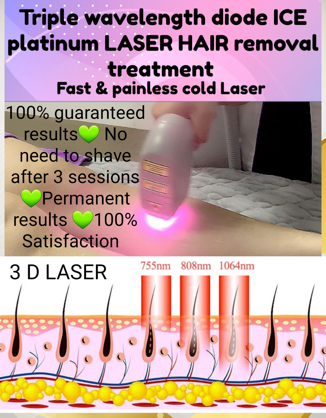 3D Triple wavelength Laser is very strong that s why it destroys the hair permanently and quickly than any other laser ( such as IPL or single wavelength Laser)