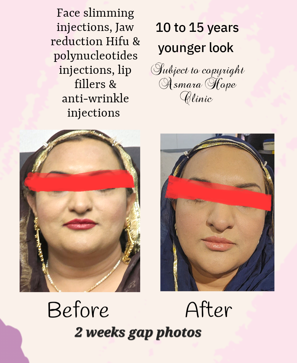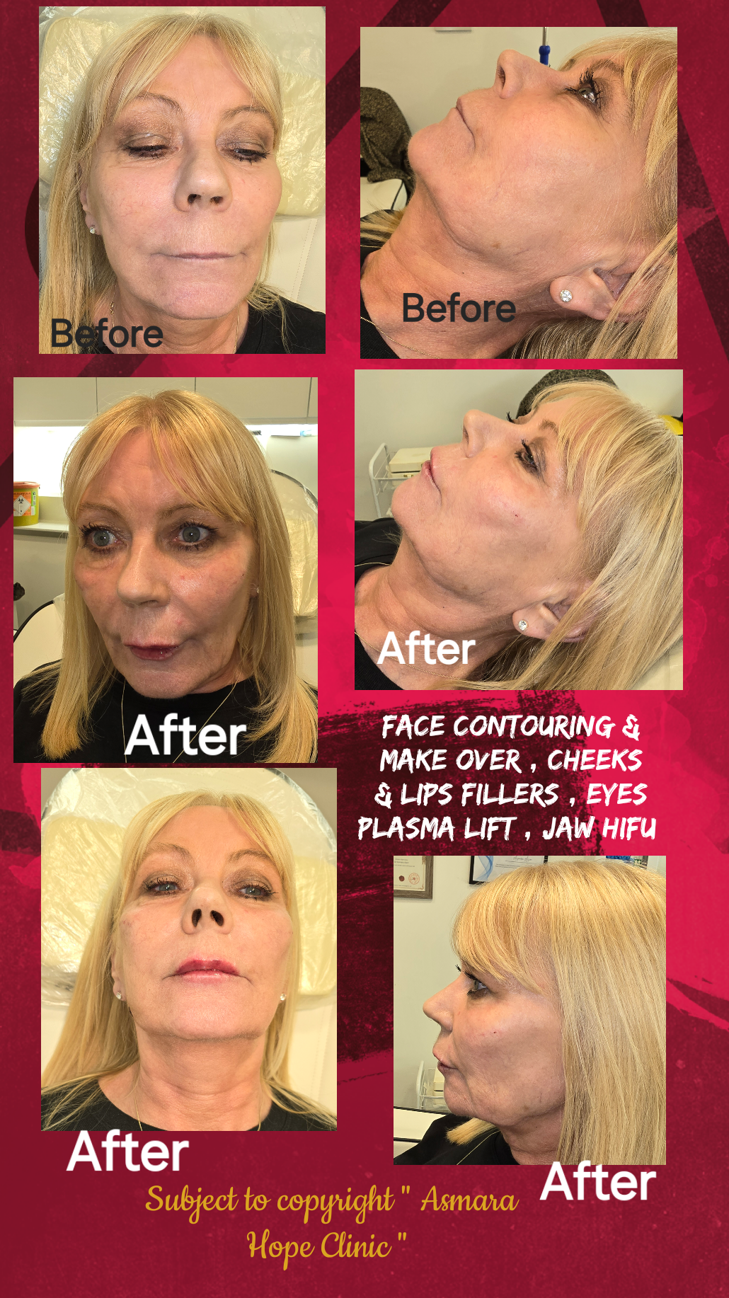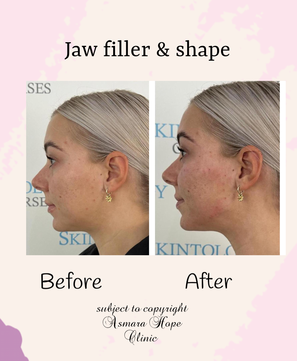 The dermal filler injections also lift the jaw line , making it a more defined shape and also the jowl line which becomes saggy with age. Filling to the right area makes the face more young and defined.