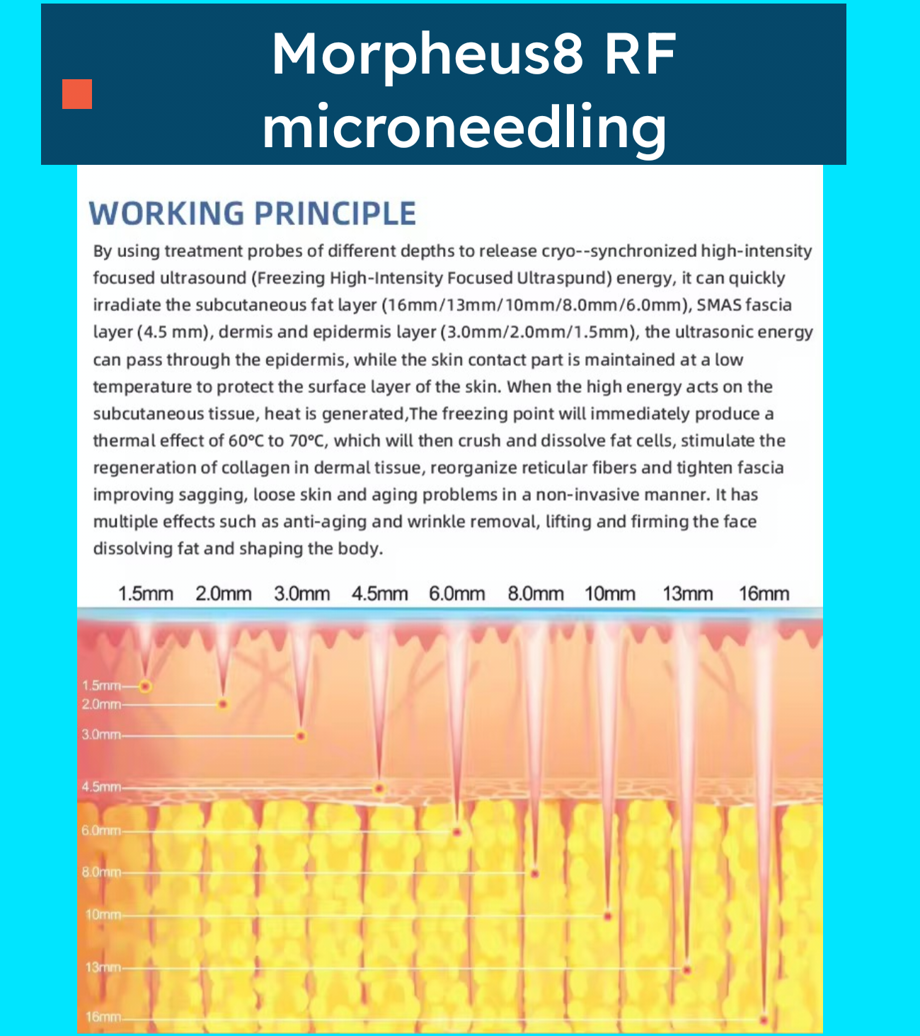Subdermal and dermal remodelling of small hard to reach areas. It’s for periorbital area,forehead, inner arms, face and neck.