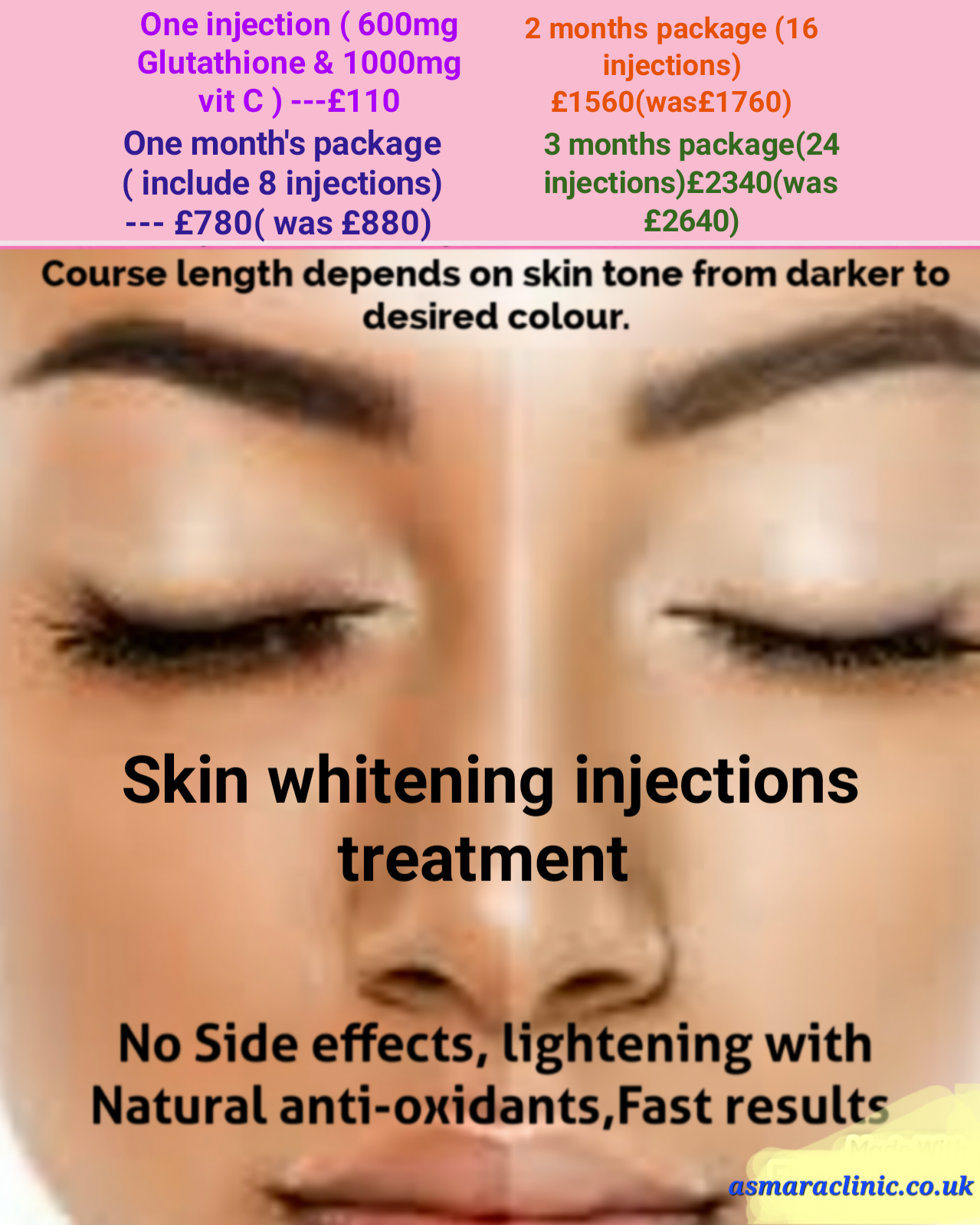 Skin whitening Glutathione IM injections monthly package is £780 ( was £880) include 8 injections with vitamin C.